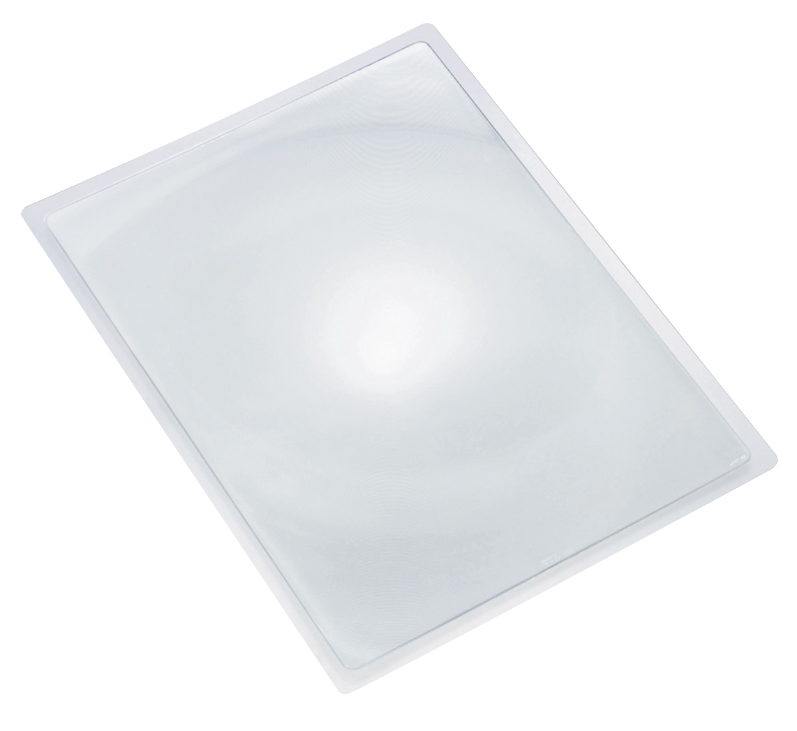 Suurennuslevy Fresnel A4. Suurennuslevyä kannatellaan käsin tarkasteltavan kohteen päällä. Suurennukseen voi hieman vaikuttaa viemällä levyä lähemmäs tai kauemmas katseltavasta kohteesta.